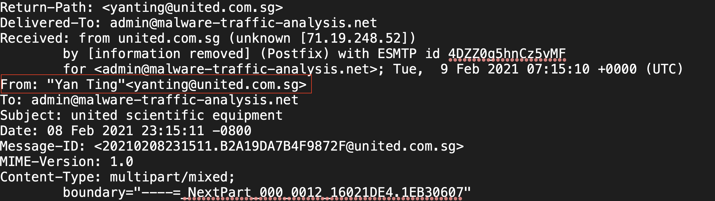 - What is the sending email address? yanting[@]united[.]com[.]sg